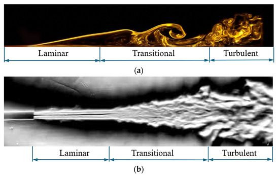 Flow visualization of the transition from laminar to turbulent flow: (a) laminar–turbulent transition in boundary layer flow [2]; (b) laminar–turbulent transition in jet flow [3].