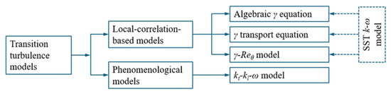 However, conventional eddy viscosity models are based on the Boussinesq approximation that assumes turbulent eddies are isotropic. Theoretically, these models are only suitable for fully developed turbulent flows or turbulent eddies in the inertia and dissipation ranges in Kolmogorov’s energy spectrum [5]. One key feature of transitional flows or flows in the transition region is that the flows are half-laminar and half-turbulent. To simulate transitional flows, these flow behaviors must be carefully formulated. Over the past decades, several transition turbulence models have been developed for this purpose. These models can be divided into two groups, namely, the “local-correlation-based” and “phenomenological” transition turbulence models, as shown in Figure 2.