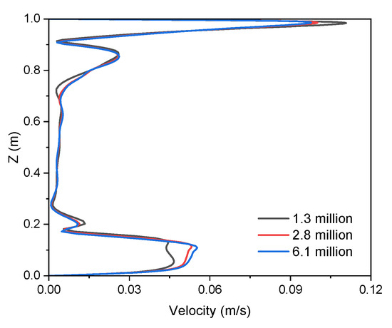 The test chamber was selected as the computational domain, which was then discretized using a structured mesh, as shown in Figure 3b. Local mesh refinement was applied in near-wall regions, resulting in y+ < 0.11 on all solid surfaces, which ensured sufficient boundary layer resolutions. Mesh independence was achieved at 2.8 million cells, as a further mesh refinement by a factor of 1.3 in all coordinate directions following the procedure recommended by Celik et al. [23] only caused a small change (<0.5%) in the air velocity profiles along a vertical test line, as shown in Figure 4. Constant temperatures were applied at the hot, cold, top and bottom walls according to the experimental condition, while the side walls were treated as adiabatic. A total of 5 computational cases, each with a different transition turbulence model, were completed, as listed in Table 1. The above model equations together with the RANS equations were discretized using the finite volume method with the 2nd-order upwind scheme and solved using the coupled solver built in the commercial CFD code Ansys Fluent 2024R2. Being different from the segregated algorithms such as the SIMPLE and PISO algorithms, the coupled solver solves the continuity and momentum equations in a coupled way, and then solves the energy and turbulence equations in a segregated way, enabling a fast convergence. Convergence was achieved within 5000 iterations when all residuals dropped below 1 × 10−4.