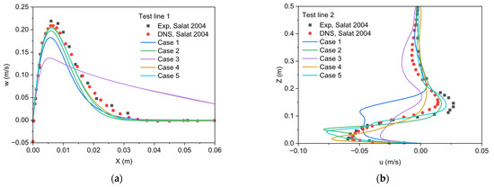 The air velocity and temperature distribution patterns yielded from the transition turbulence models described in Section 2 were qualitatively similar. However, quantitatively, these models produced different air velocity and temperature fields, indicating different capabilities of turbulence modelling resulting in different heat transfer and flow simulations. The simulated profiles of w-velocity along the short horizontal line (Test line 1) and u-velocity along the longer vertical line (Test line 2) in Figure 1 are compared against their corresponding experimental data in Figure 6a and b, respectively. The DNS data by Salat et al. [21] are also included in the figure. Figure 6a shows that all turbulence models predicted that the magnitude of the w-velocity quickly increased from the wall, then peaked at a position approximately 5–8 mm from the wall before decreasing towards the cavity center. Quantitatively, most transition turbulence models except the γ-Reθ model (Case 3) achieved good agreement with the experimental data and DNS simulation in the near-wall regions. In a larger region (Test line 2, shown in Figure 6b), the γ transport equation (Case 2) and Wilcox’s low-Re modification (Case 5) performed best, especially in the regions of Z < 0.2 m.