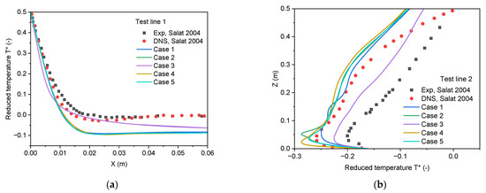 Correspondingly, the simulated air temperature profiles along the test lines are compared against the experimental data in Figure 7, where the dimensionless reduced temperature is defined by
