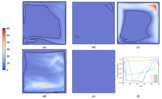The contour plots of turbulent viscosity ratio in the plane of Y = 0 m (note: the black curves in the contours represent the turbulent viscosity ratio νr = 1): (a) Case 1; (b) Case 2; (c) Case 3; (d) Case 4; (e) Case 5; (f) νr profiles.