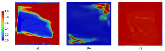 To further assess the models’ capabilities of modelling flow transition, the contours of intermittency (γ) in the plane of Y = 0 m were plotted, as shown in Figure 9, for the local-correlation-based models (Cases 1–3). According to the definition of the intermittency, γ = 0 meant the flow was fully laminar, while γ = 1 represented fully turbulent flow. As shown in Figure 9a, the algebraic γ-equation predicted that laminar flow mainly existed in the boundary layers and a region in the center of the cavity, while turbulent flows existed in a close loop region. Comparatively, the region next to the cold wall had a stronger turbulence intensity than that next to the hot wall. The transport γ-equation, on the other hand, predicted that turbulent flow only existed in two opposite cavity corners, sitting at the beginning points of the hot and cold walls, while all other regions are dominated by laminar flow, as shown in Figure 9b. The γ-Reθ model predicted that almost the entire cavity except the boundary layers was dominated by turbulent flow, as shown in Figure 9c. As the flow in the cavity was purely driven by thermal buoyancy force, and given the discrepancies between the predicted air velocity and temperature as shown in Figure 6 and Figure 7, we suspected that the level of turbulence was overpredicted by the algebraic γ-equation and γ-Reθ model. Comparatively, the transport γ-equation produced the best prediction.