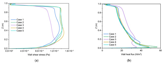 The shear stress and heat flux on the hot wall: (a) wall shear stress; (b) wall heat flux.