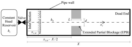 With regard to PBs, a distinction must be made between discrete, DPBs, and extended, EPBs, partial blockages. The first type, resulting from the deposition of sediment on the internal pipe wall at an early stage in terms of longitudinal length, includes features (e.g., partially closed in-line valves) that behave like an orifice from the hydraulic point of view (Figure 2a). The second type is the result of the progressive longitudinal development of DPBs along the pipe axis (Figure 2b). Accordingly, the transient response of DPBs and EPBs is remarkably different [].