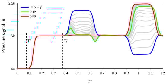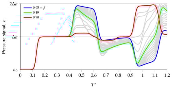 Pressure signal at for 25 and different values of (pressure signals for = 0.05, 0.19 and 0.90 are highlighted in bold, whereas those for the intermediate values of are in gray).