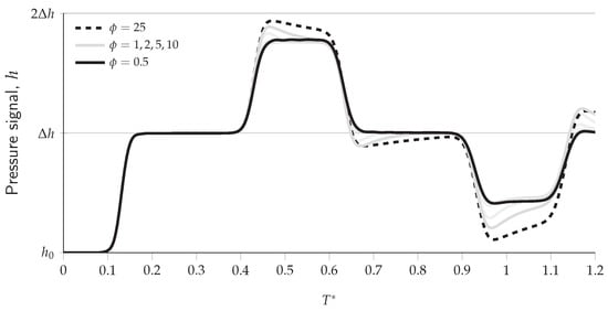 The pressure signal at the measurement section, , for the diameter ratio, 0.05 is presented in Figure 8, illustrating a range of values of (=0.50, 1, 2, 5, 10 and 25).