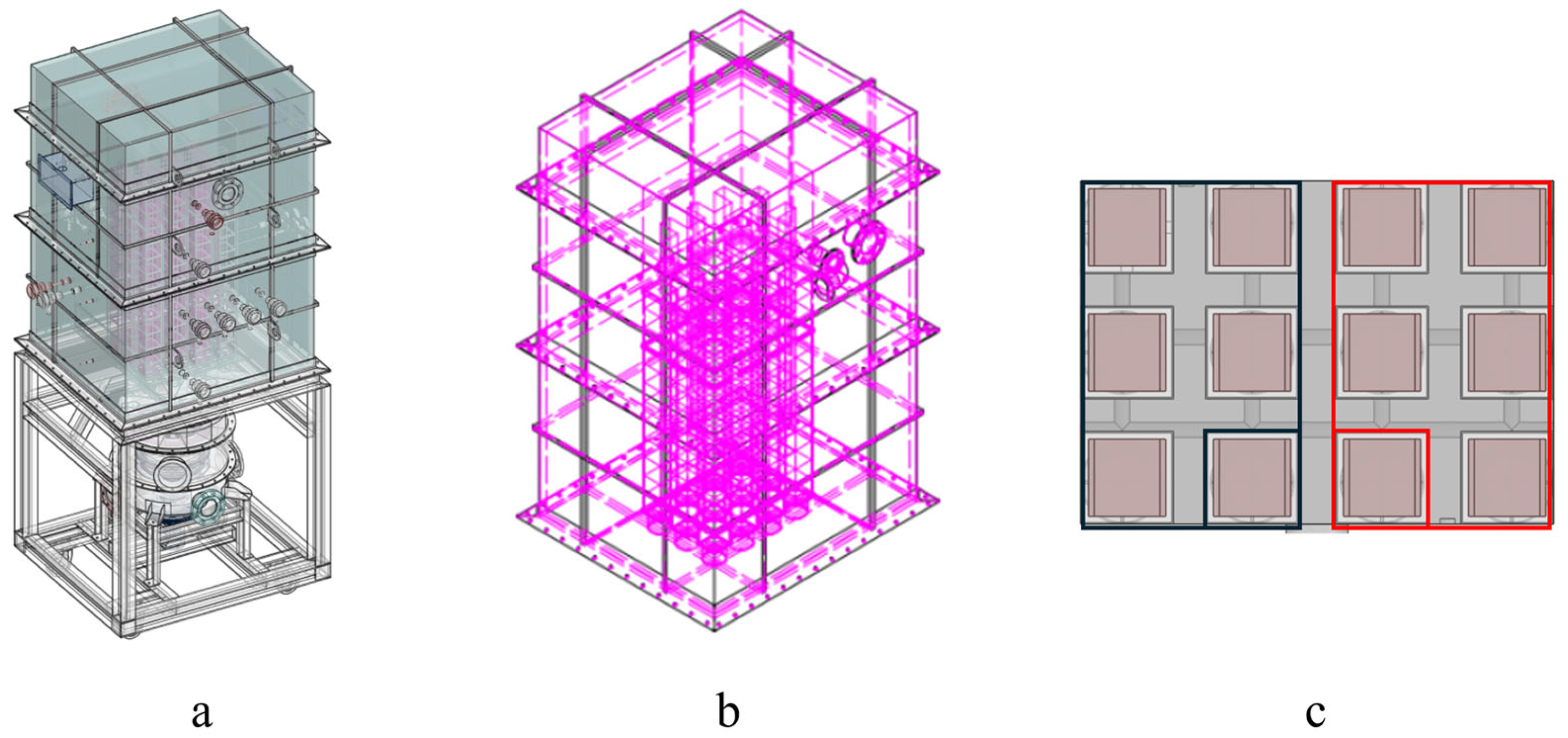 Figure 3. (a) Model of square experimental RTO furnace (b) Square experimental RTO furnace perspective view (c) Schematic diagram of gas inlet and outlet of square experimental RTO furnace.