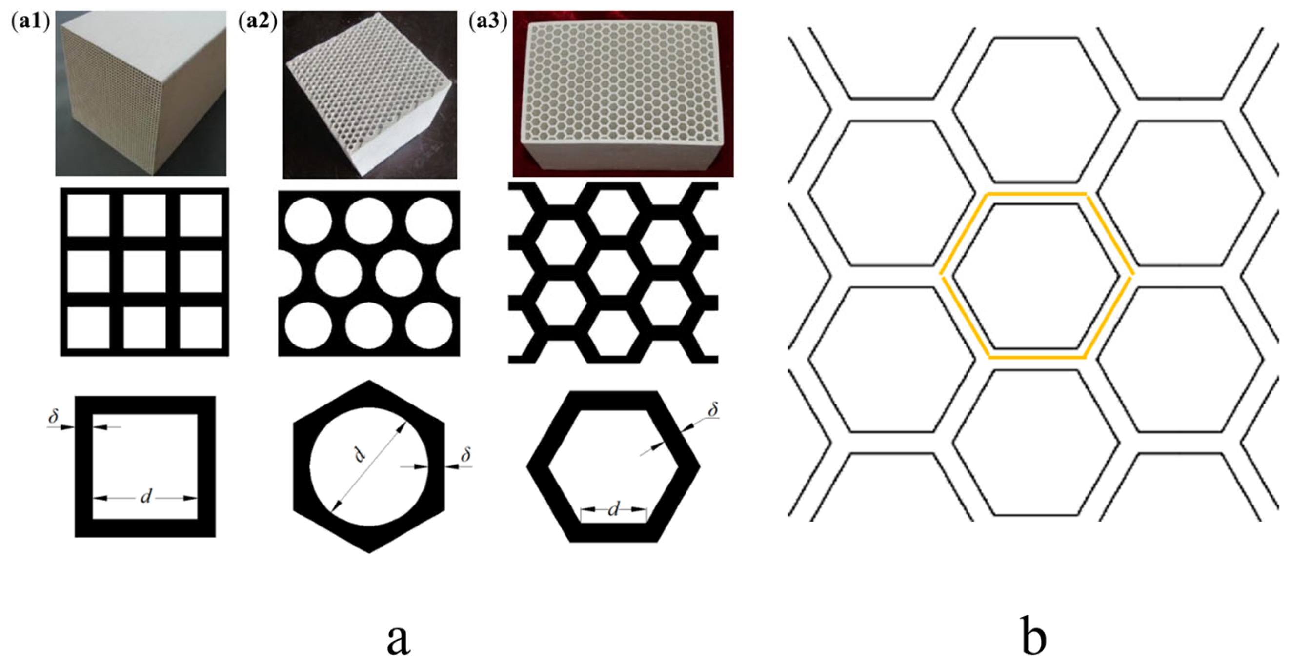 The regenerator—critical to RTO performance—utilizes honeycomb ceramic packing with regular hexagonal channel structures due to its high thermal efficiency, low pressure drop, and excellent thermal shock resistance [27]. Each honeycomb brick measures 100 mm × 100 mm × 100 mm, with multiple parallel channels aligned in stacked placement (Figure 4).
