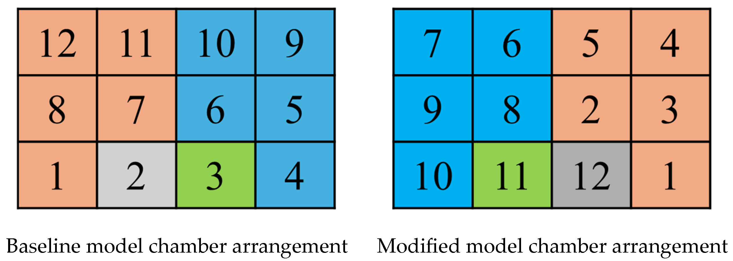 The square rotary regenerative thermal oxidizer (RTO), also referred to as a 12-chamber rotary RTO, consists of a combustion chamber, 12 independent ceramic regenerator chambers, and a continuously rotating diverter valve [25], shown in Figure 3a. The rotary diverter valve alters the gas flow direction across different regions of the ceramic regenerative beds, enabling continuous preheating of the waste gas. After oxidation and combustion in the combustion chamber, the treated gas is discharged. Compared to conventional valve-switching RTOs, the rotary architecture contains only one moving part—the rotary diverter valve—resulting in improved operational reliability and reduced maintenance requirements [26].