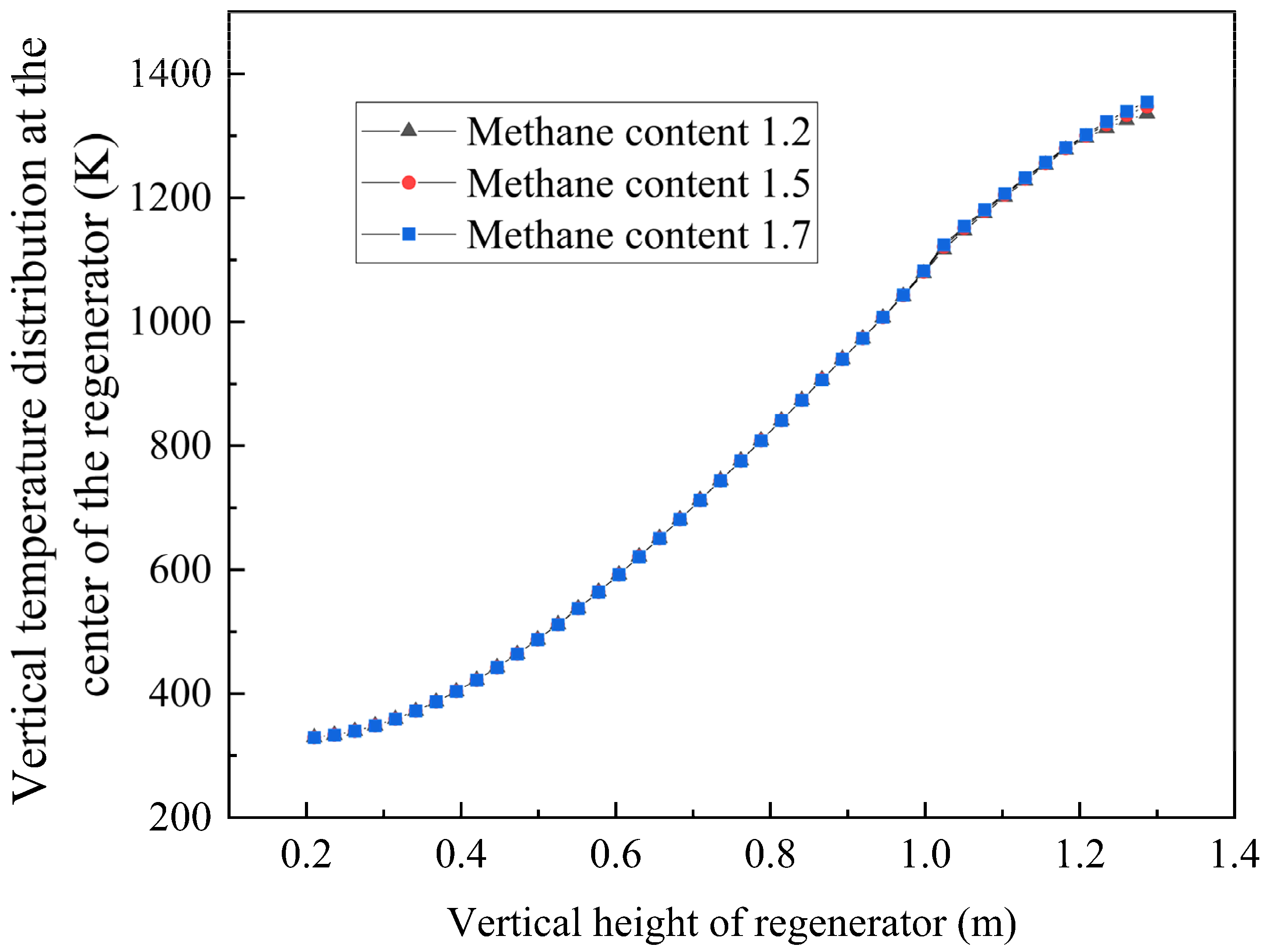 Figure 16. Variation trends of methane mole fraction and temperature with regenerator height under different exhaust gas recirculation ratios.