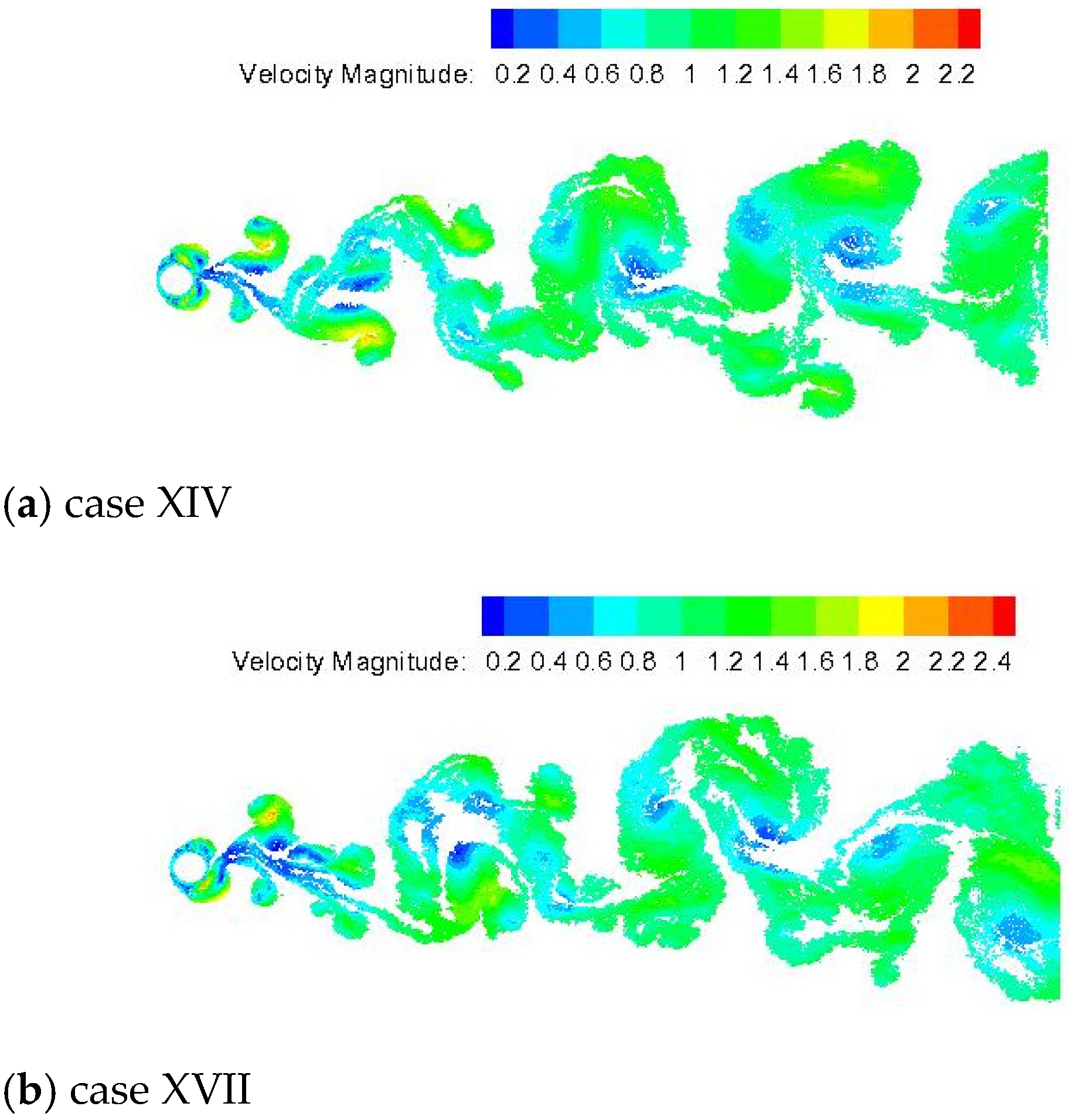 22] studied the wake modes behind a circular cylinder under streamwise forced oscillation at Reynolds numbers in the range of Re = 360–460, which are visualized using the laser-induced fluorescence technique. The forcing frequency
