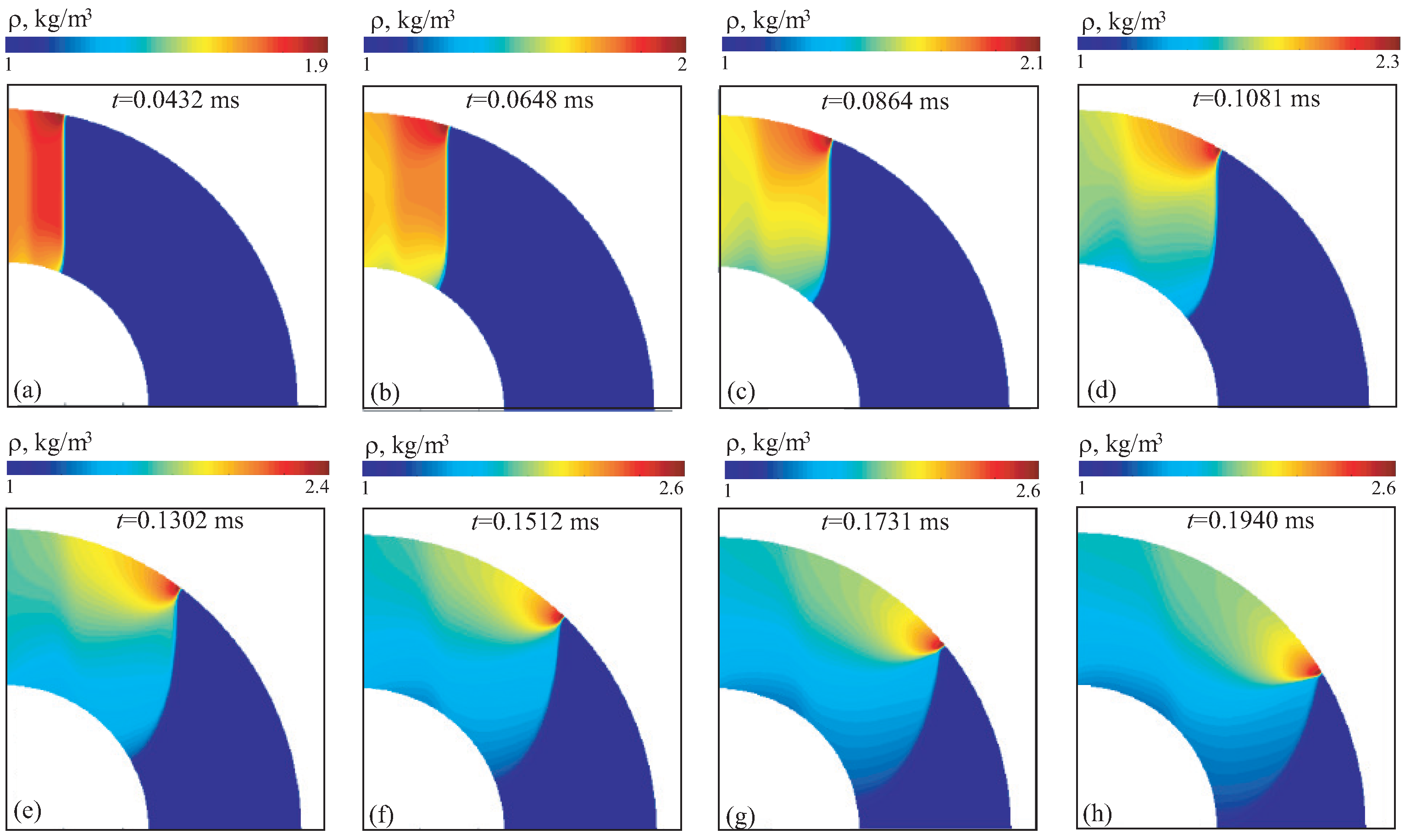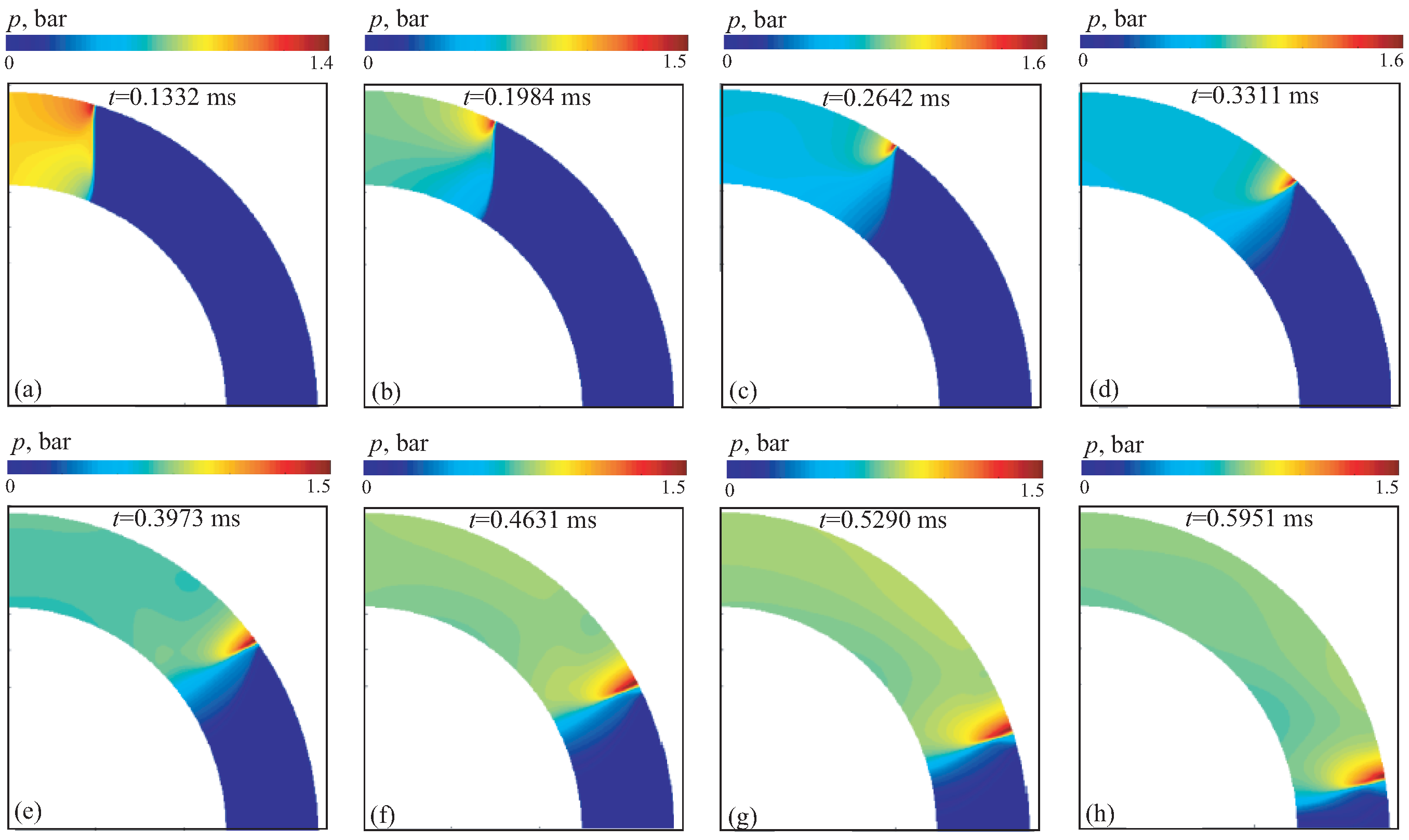 It is worth noting that the problem of shock propagation through curved channels, such as U- or S-shaped channels, tube bends, and coils, is closely related to the shock-to-detonation transition phenomenon studied in detonation engines. While the present study focuses on inert flow dynamics in annular channels, the flow patterns observed here differ from those in continuous detonation engines not only due to chemical transformations but also due to differences in the inflow and outflow schemes. Mentioning this connection helps to situate the current work within the broader context of shock-driven flows and related research on detonation initiation.