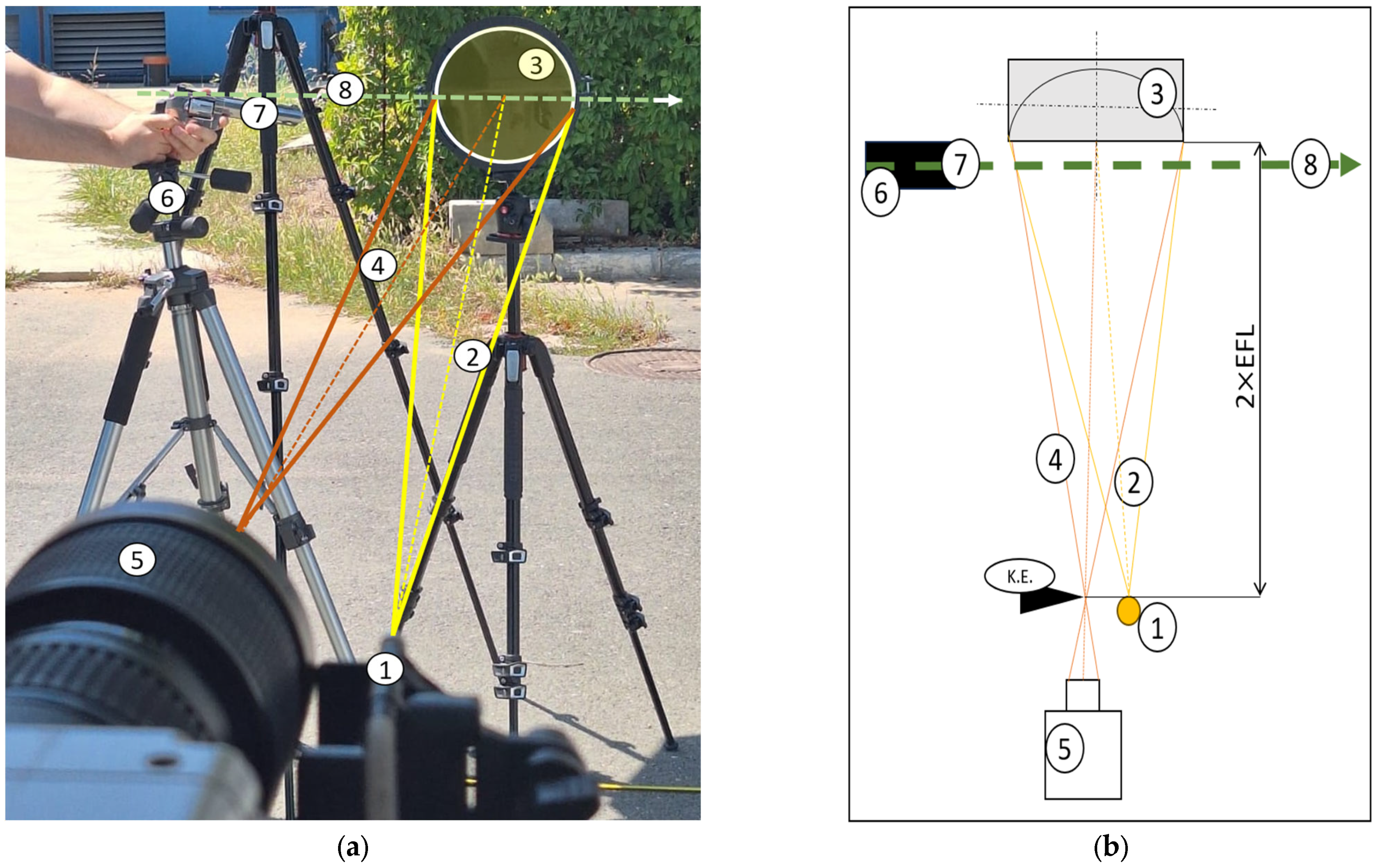The experimental campaign employed several schlieren configurations. The first was a Toepler single-mirror arrangement equipped with a horizontally oriented, anti-reflective knife edge. This series of experiments was conducted outdoors on a concrete surface, with the setup positioned 1.5 m above ground level. The elevated ambient temperature of 43 °C introduced noticeable air convection, visible in the recordings as a uniform shift in the background air stream, an effect that must be considered when interpreting the images. The single-mirror configuration was initially employed to image the projectile at close range, with the muzzle positioned 25 cm from the mirror aperture, primarily to achieve a clear, high-contrast view of the CO2 jet; this arrangement provided sharp imagery and appeared sensitive to jet structures, but the accompanying pressure waves and muzzle shock were only faintly visible.