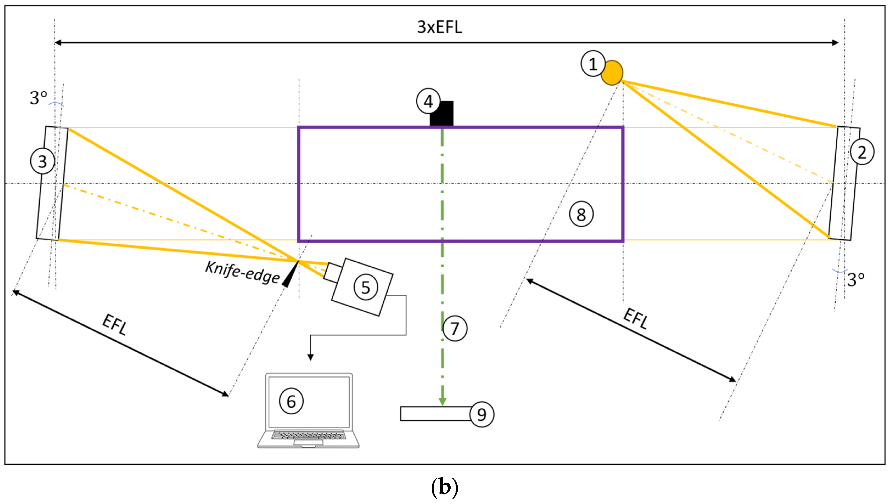 9. Mazumdar, A. Principles and Techniques of Schlieren Imaging Systems; Columbia University: New York, NY, USA, 2013. [Google Scholar] [CrossRef]