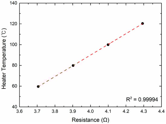 The surface temperature was determined from the linear relationship between the resistance of Pt and temperature. Before each experiment, this linear calibration curve was established at four reference points (60, 80, 100, and 120 °C) in a forced convection oven (OF-01E, JeioTech, Daejeon, Republic of Korea) using a four-wire Ohm measurement method (DAQ970A, Keysight). The calibration curve exhibited excellent linearity (R2 > 0.999) (Figure 2).
