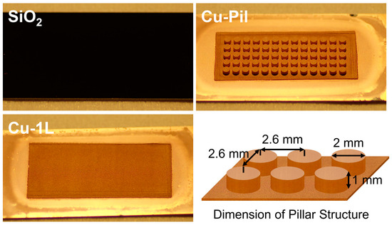 The diameter, height, and center-to-center pitch of the cylindrical pillars in Cu-Pil and CuO-Pil were 2 mm, 1 mm, and 2.6 mm, respectively. Before the experiments, all substrates were cleaned in an ultrasonic chamber using acetone (>99.8%, DAEJUNG Chemicals & Metals, Siheung, Republic of Korea), isopropyl alcohol (>99.7%, DAEJUNG Chemicals & Metals, Siheung, Republic of Korea), and deionized water for 20 min each. Figure 3 shows the pictures of boiling substrates and the dimension of pillar structure.