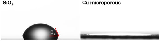 Figure 4 shows the images used for static contact angle (CA, ) measurement. To evaluate the wettabilities of the fabricated substrates, a sessile water drop (10 mL) was placed on each surface and imaged using a CMOS camera (TrueChrome Metrics, Tucsen, Fuzhou, China). The CA was determined using a CA measurement plugin integrated into the ImageJ 1.54g software (ImageJ 1.54g, NIH). The CA of SiO2 was measured as 72.0°. However, for the microporous surfaces (Cu-1L, Cu-Pil, CuO-1L, and CuO-Pil), the water droplet immediately spread into the microporous structures instead of forming a stable sessile drop, resulting in an apparent CA of 0°. This behavior arises from strong capillary wicking, in which pores rapidly draw liquid into the structure. This spontaneous penetration indicates the superior wettability of the microporous surfaces.