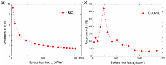 To further evaluate the influence of these uncertainties on the calculated parameters, the relative uncertainties of and were plotted as a function of heat flux, as shown in Figure 9a,b. The surface exhibiting the maximum overall uncertainty was selected as a representative reference for this analysis to provide a conservative evaluation. Although several data points at very low wall superheats or low heat fluxes exhibited relatively higher uncertainty, the overall trend showed a gradual decrease in uncertainty with increasing heat flux, despite minor local fluctuations. These localized variations did not alter the general trend or interpretation of the experimental results, confirming that the experimental data are sufficiently reliable for analyzing boiling performance.