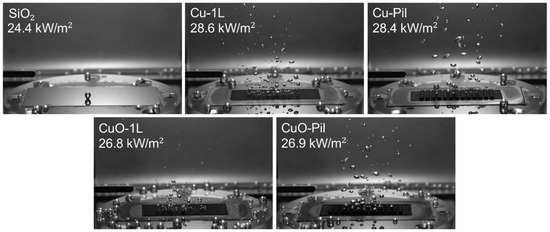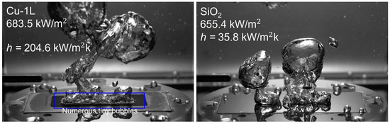 where , , , and denote the latent heat of vaporization, vapor density, liquid density, surface tension, and gravitational acceleration, respectively. The experimental value of CHF for SiO2 was consistent with Zuber’s correlation, which confirmed the reliability of the experimental setup and measurement procedures.