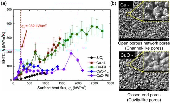Nevertheless, the BHTC of the CuO surface reached its maximum value and subsequently decreased (red mark in Figure 14a), whereas that of the Cu surface continued to increase. This reduction on the CuO surface is attributed to the insufficient liquid supply caused by the isolated pore configuration. As the surface heat flux increased, the benefit of the enhanced heat transfer from the higher nucleation site density diminished, and the ability of the open porous network to provide continuous liquid replenishment dominated. By contrast, the open pores on the Cu surface sustained both the liquid supply and BHTC and enabled a higher CHF.