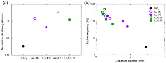 To quantitatively validate these observations, the nucleation site density (NSD), bubble departure diameter, and frequency were analyzed using high-speed visualizations (1000 fps). Figure 15a shows that the oxidized and hierarchically structured surfaces (CuO-1L, CuO-Pil) exhibited markedly higher NSD values compared with the non-oxidized ones (Cu-1L, Cu-Pil) and the smooth SiO2 surface. The Cu-1L surface presented the maximum NSD, approximately 105 times greater than that of SiO2, demonstrating the abundance of active nucleation sites provided by the porous microstructure.