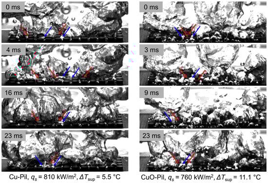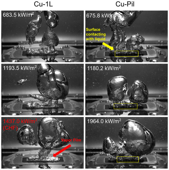 The role of the pillar structures was further examined by fabricating microporous substrates with millimeter-scale pillars, thereby combining micrometer-scale pores with millimeter-scale features that represented the near- and far-field regions of the boiling surface. Compared with their single-layer counterparts, the CHF values of Cu-Pil and CuO-Pil were enhanced by factors of 1.9 and 1.6, respectively, owing to the distinctive architecture of the Cu-Pil substrate. Figure 17 and Figure 18 present the bubble dynamics at high heat fluxes ( > 600 kW/m2). On the 1L surface, tiny bubbles continuously nucleate and rapidly coalesce with neighboring bubbles, making it difficult to identify when the surface was rewetted by the liquid.