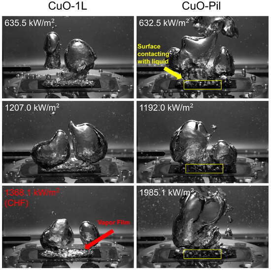 Consequently, the temporal and localized dry spots were rewetted before they developed into a fully established CHF condition. Such transient overheating followed by recovery has not been reported in conventional pool boiling experiments and highlights the unique role of superhydrophilicity and enhanced liquid supply in stabilizing the boiling process on the CuO-Pil surface. The temperature peak phenomenon of the CuO-Pil surface and the CHF of the CuO-1L surface were attained at approximately the same heat flux. Thus, the additional liquid supply from the superhydrophilicity of the nanostructured pillars was sufficient to rewet the vapor films, which would otherwise trigger the CHF on the CuO-1L surface, thereby extending the stable boiling regime.