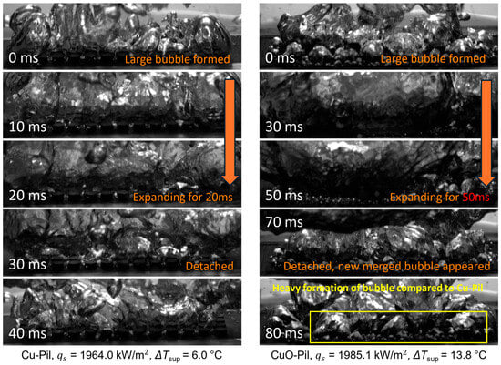 Expansion and detachment behaviors of large bubbles on Cu-Pil and CuO-Pil, at high heat flux.