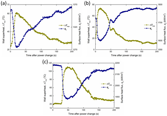 Changes in the wall superheat and surface heat flux at each temperature peak, with heat flux values finally converging to (a) 1373 kW/m2, (b) 1785 kW/m2, and (c) 2138 kW/m2 in CuO-Pil.