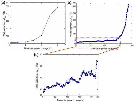 Additionally, the distinctive temperature behavior of CuO-Pil influenced the CHF conditions. Figure 23a,b show the wall superheat behavior when the CHF occurred in CuO-1L and CuO-Pil, respectively. CuO-1L exhibits a typical CHF phenomenon in which the surface temperature increases rapidly and abruptly owing to the formation of irreversible dry spots. However, in CuO-Pil, the temperature gradually increases in a step-like manner despite reaching the CHF level, as shown in Figure 23c. Finally, after more than 200 s of increasing tendency, the temperature increases rapidly.
