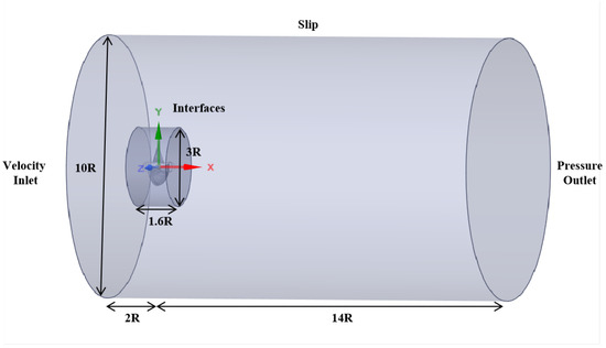 The three-dimensional fluid domains and the boundary conditions are shown in Figure 2. The coordinate system is defined such that the x-axis is aligned with the propeller shaft, while the y- and z-axes lie in the radial plane perpendicular to the shaft axis.