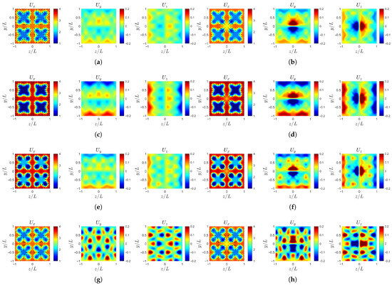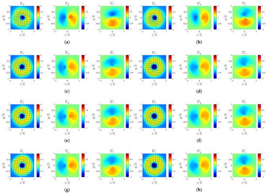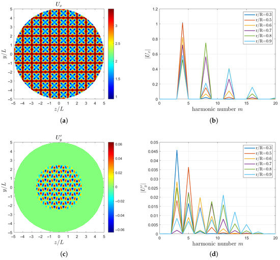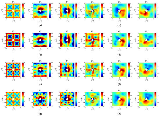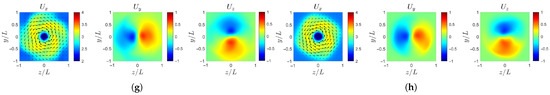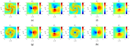 Equations (7), (14), and (15) are directly applied at the inlet boundary to define the velocity field. Figure 3a,c,e show the plots of the axial velocity and the transverse velocities and , while Figure 3b,d,f show their harmonic number spectra at different radial positions (). The harmonic number of are primarily , and those of and are mainly . In the following analysis, the characteristic length L is set equal to the propeller radius R.