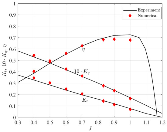 Based on the mesh independence study, the validation of the numerical model is conducted by evaluating the open-water performance of the propeller under uniform inflow conditions. The comparison between the numerical results and experimental data [24] is shown in Figure 5. These show that the simulation results of thrust coefficient, torque coefficient, and efficiency are consistent with the experimental data, confirming the reliability of the developed numerical model.