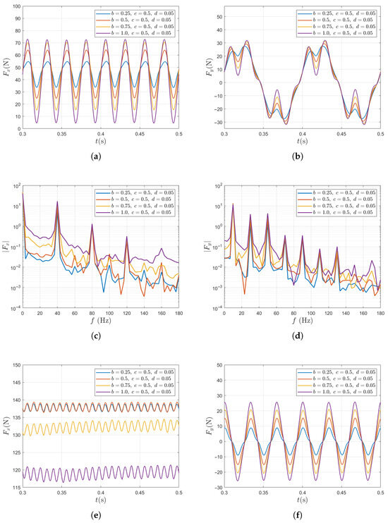Unsteady force responses for varying b in the two-scale wake inflow. The results of single blade: (a) in time domain, (b) in time domain, (c) in frequency domain, (d) in frequency domain. The results of entire propeller: (e) in time domain, (f) in time domain, (g) in frequency domain, (h) in frequency domain.
