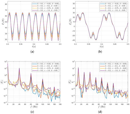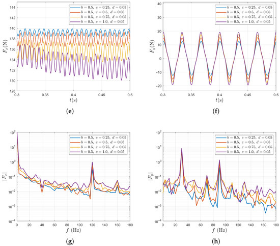 Unsteady force responses for varying c in the two-scale wake inflow. The results of single blade: (a) in time domain, (b) in time domain, (c) in frequency domain, (d) in frequency domain. The results of entire propeller: (e) in time domain, (f) in time domain, (g) in frequency domain, (h) in frequency domain.