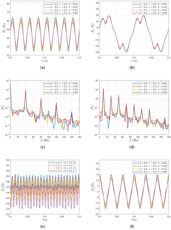 For a single blade, as the large-scale Fourier mode amplitude b increases from 0.25 to 1, the fluctuation amplitude of the thrust increases significantly from 13.8% to 53.71%, indicating a strong sensitivity to large-scale inflow disturbances (Figure 8a). Meanwhile, the fluctuation of the lateral force also increases, although to a much lesser extent (Figure 8b). The frequency spectrum of is dominated by peaks corresponding to the axial inflow harmonic number (). Given the propeller’s fundamental frequency , these peaks appear at , and (Figure 8c), indicating that the unsteady thrust is primarily governed by the harmonic number of the axial inflow . The frequency spectrum of is mainly influenced by the propeller’s fundamental frequency and the harmonic number () of transverse velocity . Its major peaks appear at , and (Figure 8d).