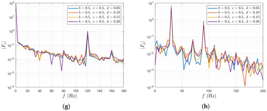 Unsteady force responses for varying d in the two-scale wake inflow. The results of single blade: (a) in time domain, (b) in time domain, (c) in frequency domain, (d) in frequency domain. The results of entire propeller: (e) in time domain, (f) in time domain, (g) in frequency domain, (h) in frequency domain.