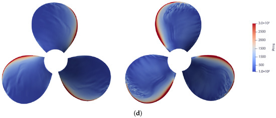 The Figure 11 shows the spatial distribution of pressure fluctuation on both the pressure side (left half) and the suction side (right half) of the propeller blade for the four representative inflow conditions. Due to the inflow non-uniformity, the local angle of attack experienced by the blade varies during rotation, resulting in a prominent high-pressure-fluctuation strip along the leading edge.