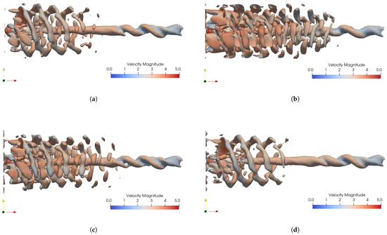 Three-dimensional vortex structures of the propeller wake (, ): (a) case-ori, (b) case-b, (c) case-c, (d) case-d.