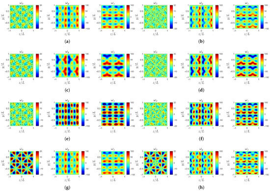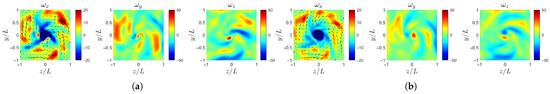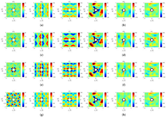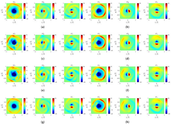 Further downstream, as shown in Figure 20 and Figure 21, the high-vorticity regions of gradually break up into smaller-scale structures. The rate of this evolution differs significantly among the cases. The case-d first develops circular high-vorticity regions (Figure 21g) at . Then, the case-ori with similar circular patterns appears later at (Figure 20b). For the case-b and case-c, the evolution proceeds more slowly, and the circular structures do not emerge until (Figure 22c,e). Regarding the transverse vorticity components and , all four cases exhibit spiral structures at the location . Among them, the case-c and case-ori form more stable and symmetric spiral patterns earlier, whereas case-b and case-d display a delayed development.