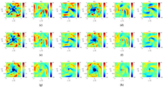 Instantaneous vorticity profile at : (a) case-ori at . (b) case-ori at . (c) case-b at . (d) case-b at . (e) case-c at . (f) case-c at . (g) case-d at . (h) case-d at .