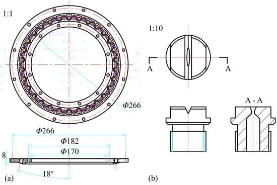 Elliptical nozzles have demonstrated significant advantages in enhancing cooling efficiency and improving cooling uniformity. Building upon the findings of Joshi [19] and Schuller [22], this study designs a novel water-spray ring equipped with elliptical nozzles, as shown in Figure 3. Based on the classical double-row hole arrangement, the spray ring maintains injection angles of horizontal and 18° outward to ensure a wide cooling coverage area; the nozzles are evenly distributed along the circumference, thereby achieving uniform cooling of the roller surface. Compared with traditional circular nozzles, the nozzle structure in this study introduces innovative improvements by adopting a bolted interface, which allows multi-angle rotation and replacement with different specifications. Specifically, the nozzle is designed in a bolt style that matches the spray ring, with an elliptical orifice at the head, a cylindrical flow channel inside, and a smooth transition structure along the minor axis to reduce flow losses. In addition, triangular diffusion grooves are arranged along the major axis at the nozzle head to enhance the diffusion and coverage of the coolant, thereby further improving cooling performance.