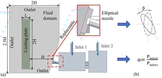 A finite element model was constructed using the Fluent platform based on the actual physical configuration. A cooling plate model was positioned H in front of the nozzle, and a geometric fluid domain was created to enclose it. The final computational model is shown in Figure 5a. Two key parameters were selected for the simulation: the gas–liquid pressure ratio (α) and the inclination angle (β) of the elliptical nozzle, as illustrated in Figure 5b. The inclination angle β is defined as the angle between the major axis of the elliptical nozzle and the vertical direction. In the simulation, Fluid Domain 1 was completely filled with cooling liquid, while Fluid Domain 2 was filled with either cooling liquid or nitrogen depending on the operating conditions. To investigate different jet characteristics, the inclination angle of the elliptical nozzle was varied by adjusting the nozzle structure and orientation.