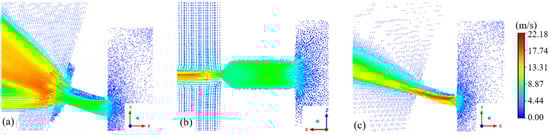 Considering the computational time and cost, a fixed simulation time step was adopted to analyze the velocity distribution of cooling liquid at the nozzle outlet under different nozzle inclination angles and gas–liquid pressure ratios, as summarized in Table 3. For each value of α, a circular nozzle was included as a reference for comparison.