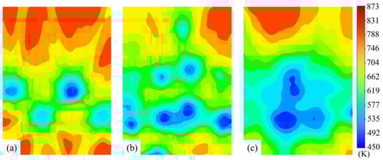 Cloud map of the surface temperature distribution of the cooling plate before the nozzle: (a) circular nozzle, (b) elliptical nozzle at α = 0° and (c) elliptical nozzle at α = 90°.
