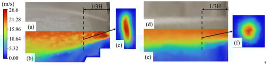 Coolant medium ejection state (a) experimental results of elliptical nozzle (b) simulation results of elliptical nozzle (c) simulation results of the cross-section at the front 1/3 H of the elliptical nozzle (d) experimental results of circular nozzle, (e) simulation results of circular nozzle, and (f) simulation results of the cross-section at the front 1/3 H of circular nozzle.