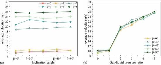 Variation curves of the elliptical nozzle average velocity with (a) nozzle inclination angle and (b) gas–liquid pressure ratio.