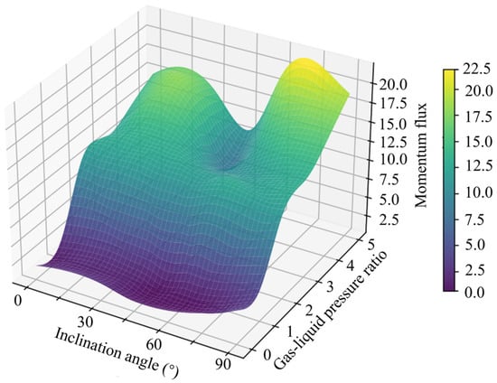 Figure 13 shows the variation in momentum flux with the inclination angle of the elliptical nozzle and the gas–liquid pressure ratio. When β = 45°, the momentum flux is noticeably lower than at other angles, mainly due to the uneven velocity distribution over the elliptical cross-section and its projection relative to the jet direction. In contrast, at β = 0° and 90°, the velocity components remain aligned with the principal axis, leading to smaller disturbances and weaker changes in momentum flux. Increasing the gas–liquid pressure ratio significantly raises the momentum flux, consistent with its approximate dependence on the square of the jet velocity. A higher gas–liquid pressure ratio further strengthens momentum exchange, demonstrating the coupled enhancement effect of nozzle geometry and gas–liquid interaction [35,36].