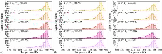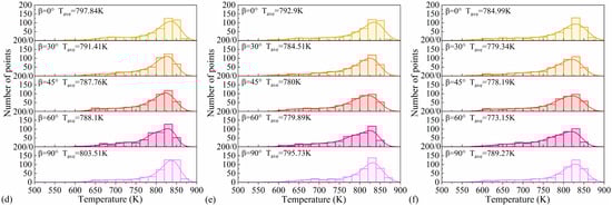 Using the experimental setup shown in Figure 9, experiments were conducted on the elliptical nozzle at nozzle angles and the circular nozzle under gas–liquid ratios of 0 and 2. During the experiments, after cooling for 10 s, the surface temperature of the cooling plate and the spray status of the coolant were recorded. Within the study area, 500 characteristic points were evenly selected for temperature measurement and statistical analysis. Each experiment was repeated three times under the same operating conditions, and the average value was taken as the final data. During measurement, the accuracy of the infrared thermometer and system errors were considered, and data uncertainty was quantified using the standard deviation, with a maximum error of less than ±0.8 °C. Subsequently, the heat transfer coefficient on the cooling plate surface under different nozzle parameters was calculated according to Equation (13), and the results are shown in Table 4.